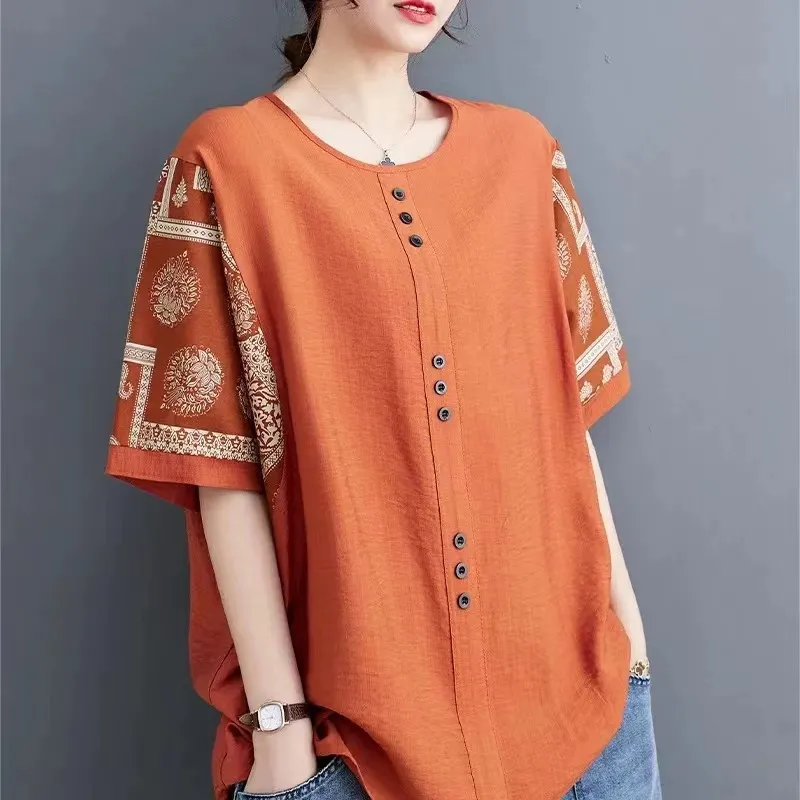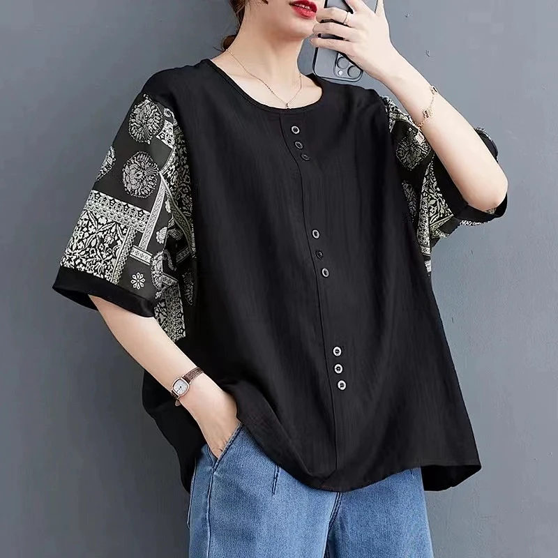 半小時前夏季新款棉麻短袖t卹女款寬鬆大尺碼胖mm印花拼接媽媽五分袖純棉上衣 - 買二送二! 僅售 NT$ 1498
